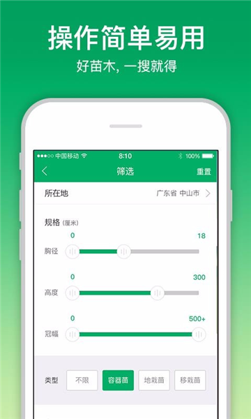 2、提供筛选苗木的功能,支持直接根据所在地以及规格等进行筛选查看苗木;