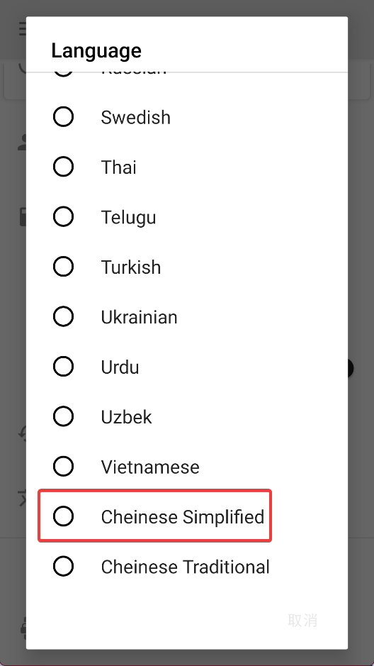 3、找到language,在最下面找到Chinese Simplified并选择,重启应用。