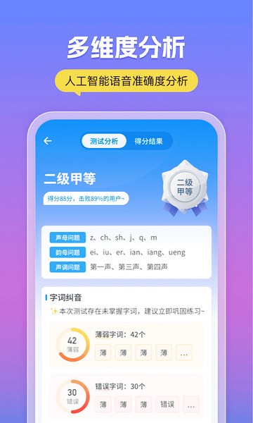 3、普通话专项提高无论是平翘舌,前后鼻音,轻声儿化,nl不分还是方言纠正,都有专项训练课程,由30名普通话教学大师共同编制,足不出门,就能有效提升。