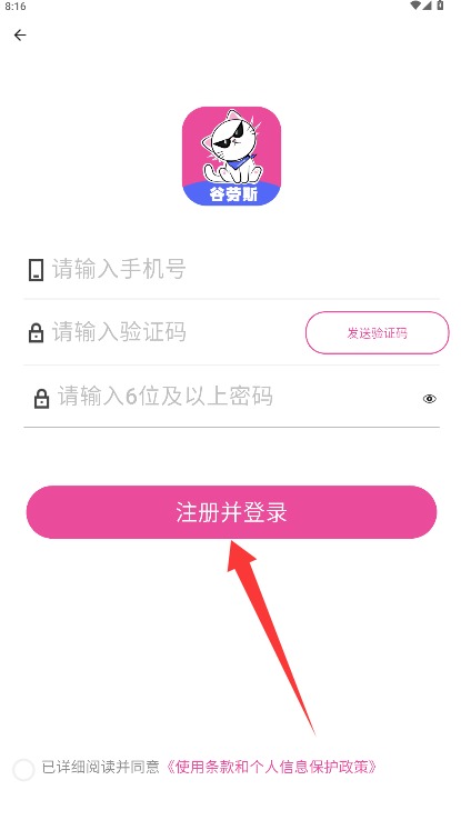 2、在登录页面输入手机号和验证码并设置密码,勾选同意协议后点击注册并登录。