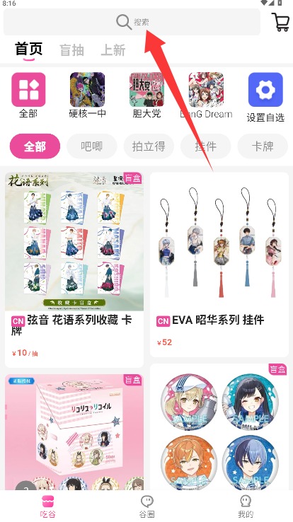 3、在首页界面顶部搜索栏输入盲盒名称或相关关键词,搜索需要的商品进行浏览。