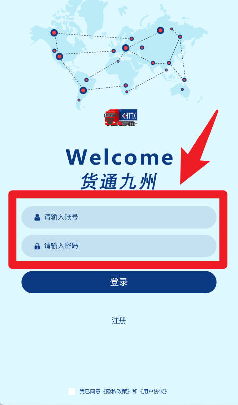 1、在登录页面输入账号和密码即可进入系统,登录前需确认阅读并同意相关用户协议和隐私政策,保障账号安全。