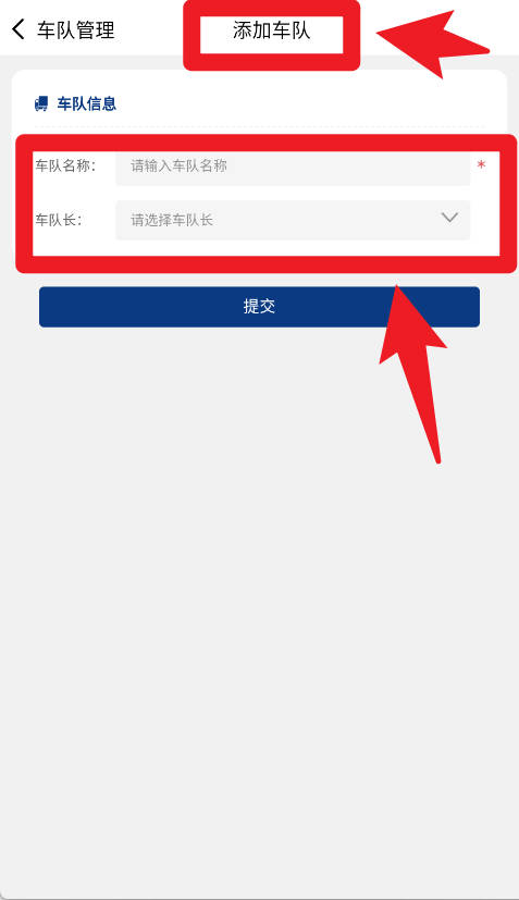 5、在添加车队模块中输入车队名称并选择车队长,点击提交即可完成车队创建,帮助建立高效的承运团队。