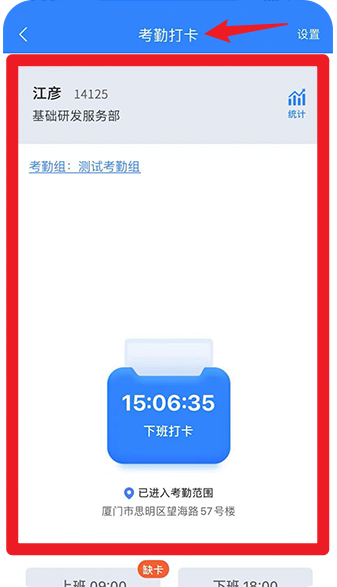 4、考勤打卡界面支持实时显示打卡状态和时间,进入考勤范围即可完成上下班打卡,系统自动记录数据。