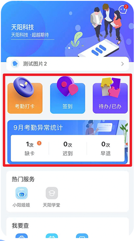 3、展示考勤打卡、签到、待办已办等常见办公入口,同时统计考勤异常情况,便于员工查看考勤记录。