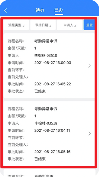 5、代办、已办页面详细显示审批申请的名称、申请人、申请时间和处理结果,帮助员工随时掌握流程进度与状态。