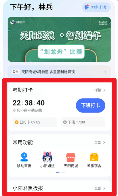 2、提供考勤打卡功能,清晰显示上下班时间,并整合常用功能入口如移动审批、商城、宿舍等,方便随时使用。