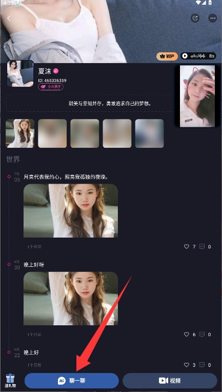4、进入用户资料页面查看详细信息,点击聊一聊功能即可开启私信对话功能。