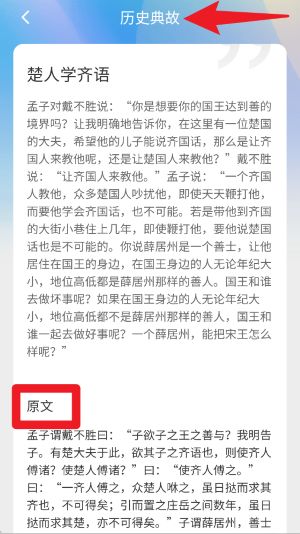 4、进入历史典故页面后,用户可以阅读完整的故事内容,原文可查看典故的古文原版,方便更深入学习与理解。