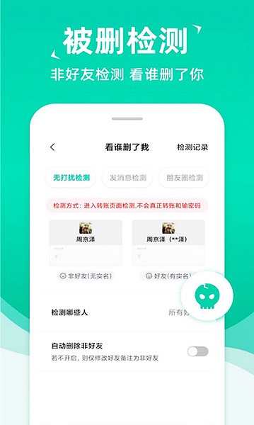 3、首页的“看谁删了我”功能可以帮你快速检测,哪些微信好友已经将你删除了,方便你统计数据。