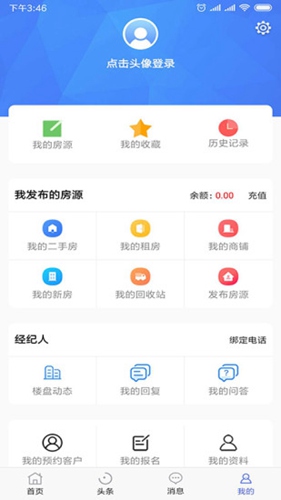 1、输入手机号和验证码登录软件,默认进入到首页,会很多房源可以查看,切换到“我的”,选择我的房源管理中的“我要发布”。