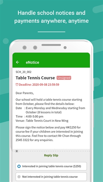 家长可透过电子通告随时于手机签阅通告及翻查旧有的通告纪录,快捷轻松。