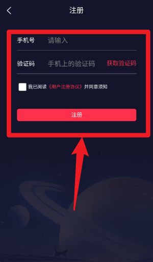 2、点击注册进入注册页面,在红框中填写手机号、验证码并勾选协议后点击注册按钮即可完成账号创建。