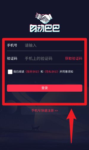 1、打开自动巴巴后在登录页面红框中输入手机号及验证码,勾选协议后点击登录按钮即可完成快速登录操作。