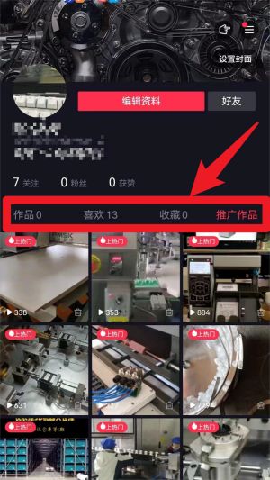 5、进入我的页面后,展示了发布作品、点赞记录、收藏及推广内容,便于用户管理和查看个人视频内容。