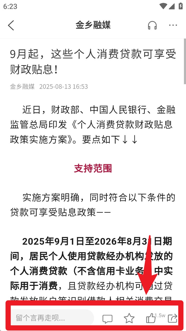 3. 在新闻详情页,可阅读全文,并使用底部的点赞、收藏或评论功能进行互动。