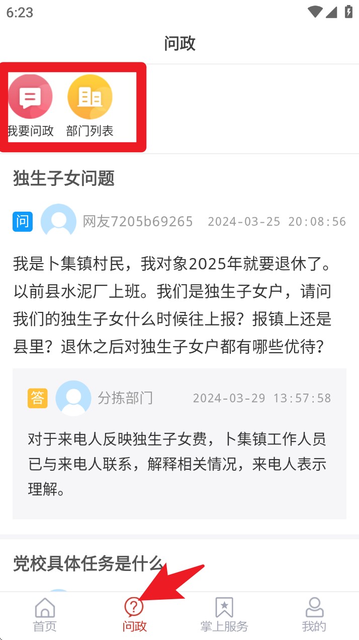 4. 切换至问政栏目,点击顶部我要问政或部门列表,可进行政策咨询或查看部门信息。