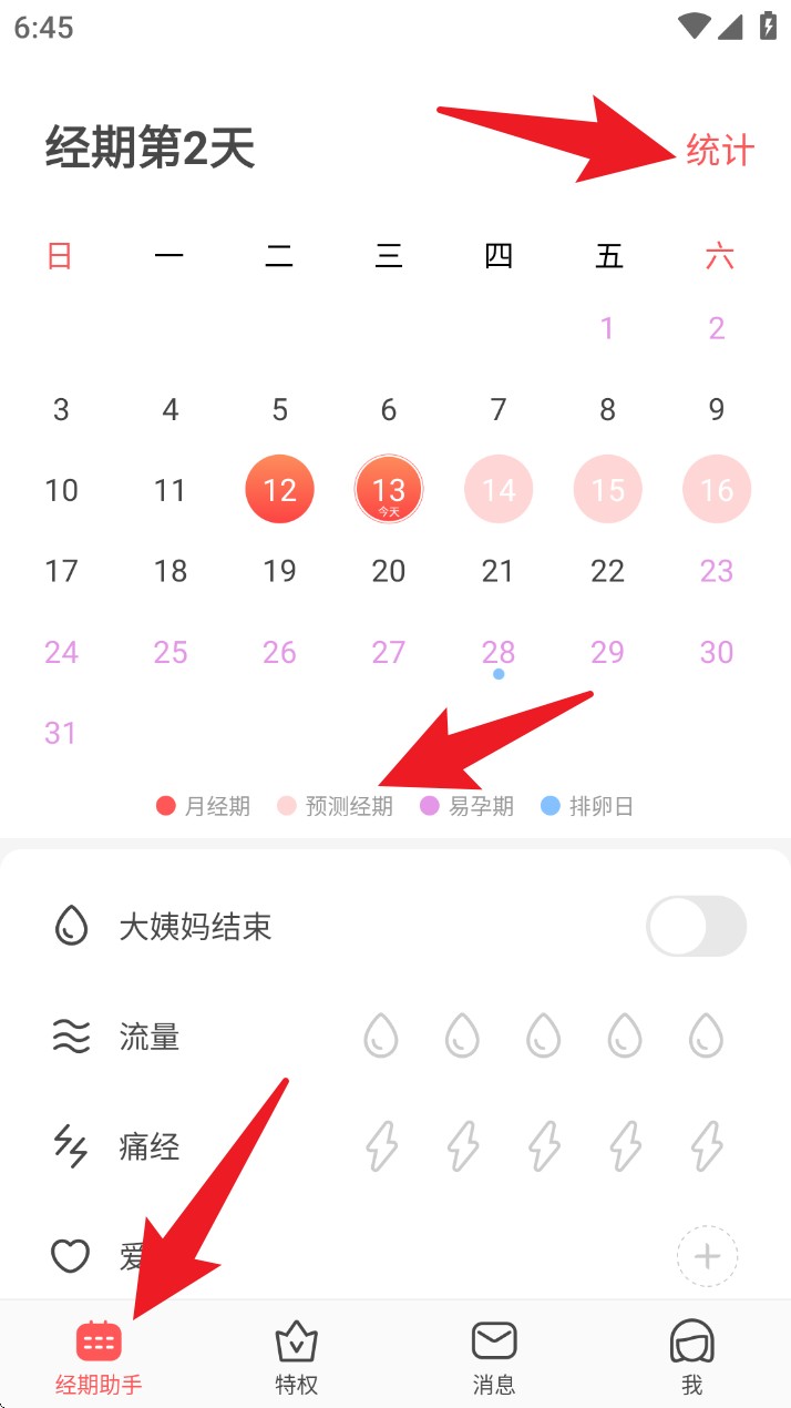 2. 在经期建议主界面,可查看当月日历,标记月经期、易孕期及排卵日,并记录流量、痛经及情绪等信息。