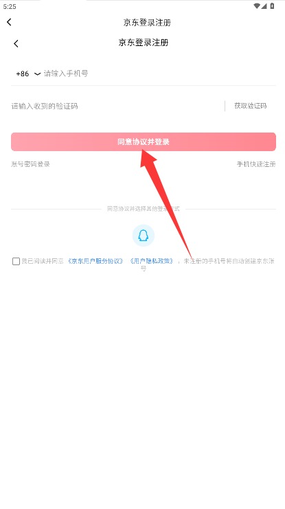 3、系统会自动跳转至注册登录界面,输入手机号和验证码,点击同意协议并登录。