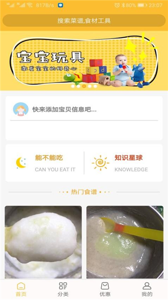 3、食谱分类:可以查看平台提供的宝宝辅食分类,按照分类就能快速找到合适宝宝的食谱;