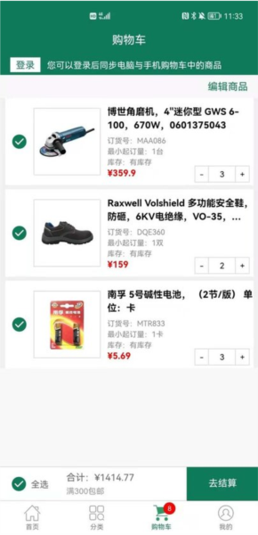 2、便捷购物车操作: 可以编辑购物车,添加或删除商品数量,一键结算购物车商品并在线跟踪交易订单状态和物流运输位置。