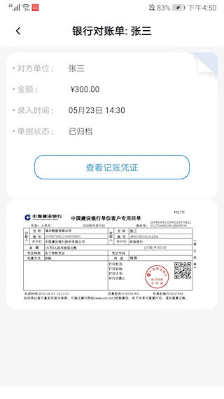 3、查阅单据详细信息选中任意一条历史记录,即可查看该单据对应的单位名称、交易金额、录入时间、单据状态及记账凭证等核心详情;