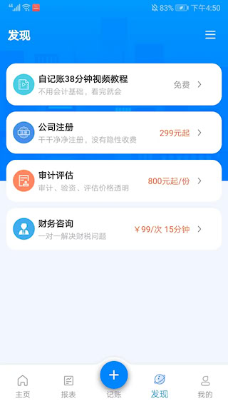 6、探索发现界面实用功能进入【发现】栏目,可使用视频教程、公司注册、审计评估、财务咨询等多元化辅助功能;