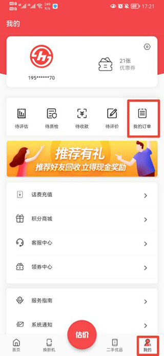 1、首先打开速回收App,找到“我的”页面,点击“我的订单”选项;