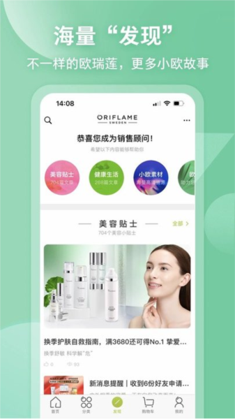 1, 海量发现: 创新的欧瑞莲购物理念聚集地,提供多功能资讯搜集平台。顾问可获取公司最新讯息、研讨会信息、达人推荐和美容贴士等。图文并茂的形式让用户第一时间获取所需资料。