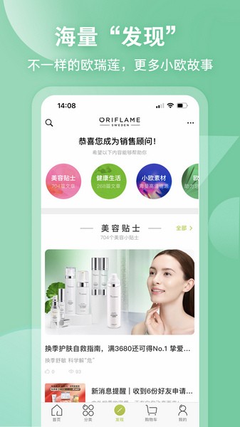如果你担心错过软件的信息推送,那么你可以打开移动欧瑞莲最新版中专属于您的信息提示,这样一来所有重要信息都不会错过。打开手机就会收到信息提示,即便错过了也能在APP的个人消息中找到所有的消息提醒。此外,移动欧瑞莲app最新版2023还从快捷入口、当月折扣到奖励计划等层面,通过对每个信息精准地控制与设计,将众多内容更有效地呈现给用户。例如新品上市专题推荐融合了多元化的内容和商品购物车的结合形式,鼓励顾问进行探索性购物、获取知识或分享事业发展经验等等