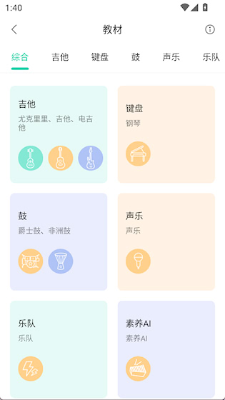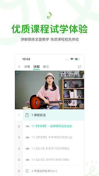 2、丰富乐器教学内容:覆盖吉他、声乐、爵士鼓、后期制作等多种音乐领域,满足多样化的兴趣需求,适合初学者与进阶者使用。