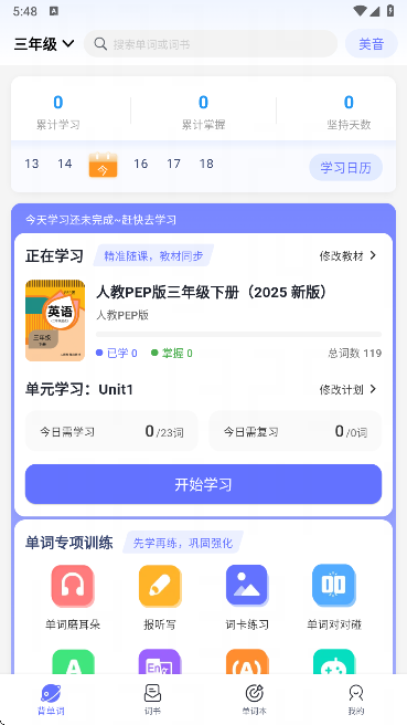 2、进入背单词页面,可见多种学习与练习功能模块,按需选择使用;