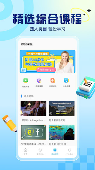 1、外教实时对话:提供专业外教在线授课,围绕日常、职场、旅行等真实场景展开口语练习,帮助学习者自然开口说英语。