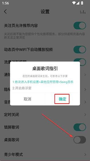 2、点击桌面歌词,按说明授予权限后返回再次点击完成开启