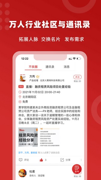 火栗网平台建立了以用户为核心的不良资产行业社区,方便用户发布对接业务需求,检索查找行业人脉与机构,设置了私信、换名片等功能方便从业者拓展人脉与业务关系。