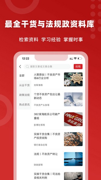 平台收集不良资产行业相关的监管政策、法律法规与业内人士的案例分析、政策解读、业务感悟、市场观察等从业干货,还有行业前沿热点事件与新闻,归纳整理为文摘合集,方便从业者检索政策法规、掌握重点资讯与学习从业知识。