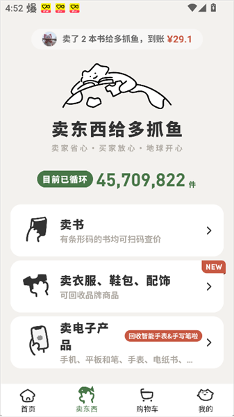 使用多抓鱼 App 在线提交闲置的书籍、服饰和电子产品,获得估价。顺丰快递会按照你预约的时间免费上门取件,仓库在收件审核之后会立刻打款给你。