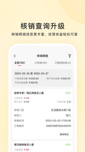 3、订单核销:平台提供一键核销功能,帮助商家快速、准确地核销用户的订单。这有助于商家及时处理订单,洞悉订单数据,提高订单管理的效率。