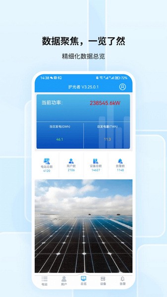 1、数据概览:对电站的各组主要数据进行统计,提供了各个数据来进行概览了解;