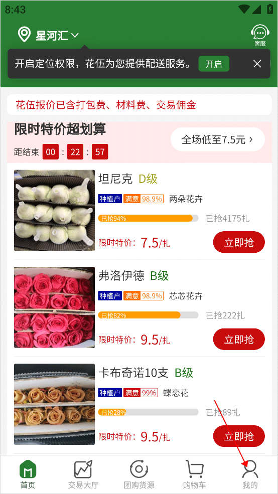 1、打开花伍鲜花 app,点击右下角【我的】。