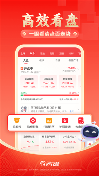 同花顺手机炒股软件官方免费版是一款专为喜欢炒股的老股民准备的炒股软件,因此在这里用户们可以查看股市的走向,并且还有很多的经济专家在这里分享自己的经济理念,让用户们可以去收听他们的股市走向推测,同时软件还能提供往期的股市走向变化,方便老股民从中总结自己的炒股心得等,因此感兴趣的玩家,快来下载软件体验吧!