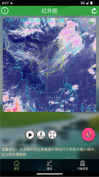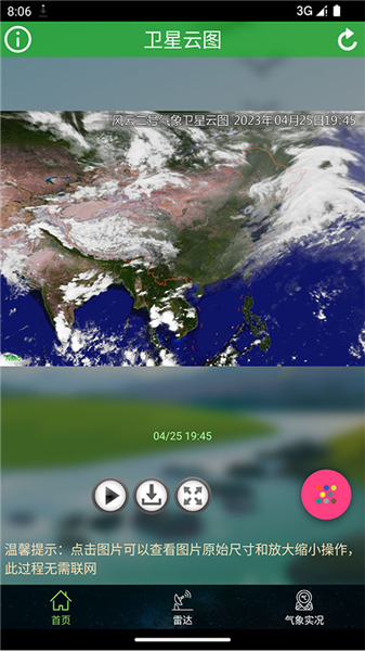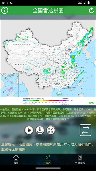 1、进入app主页,在“雷达”栏目中点击播放按钮即可实收接受最新的天气实况