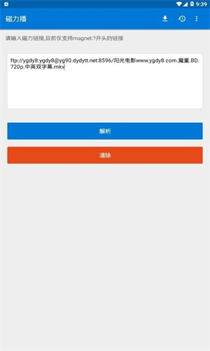磁力播是一款集磁力链接解析、在线播放与下载功能于一体的视频软件。观众只需将磁力链接粘贴至搜索框,即可快速解析并直接播放视频内容,也可选择将视频文件保存至云盘或下载到手机本地。软件采用断点续传技术,下载速度最高可达10M/s,支持视频、图片等多种文件类型的缓存。所有解析与下载记录均自动保存在历史列表中,便于观众查找与管理。即使本地文件意外删除,也能通过历史下载记录重新获取,兼顾使用效率与数据留存。