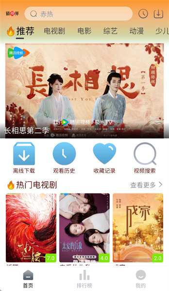 猫视界是一款为影视剧爱好者提供的免费追剧宝藏软件。软件ui界面非常简洁,提供了首页、排行榜两个主要的板块,进入首页就可以从上方的电视剧、电影、综艺节目、动漫等视频分类中选择爱看的视频。还有离线下载、观看历史、收藏记录、视频搜索的标签页面,满足了用户在视频观看方面的所有需求。喜欢的影视剧可以先收藏、或者下载,视频永远不会下架永久保存。