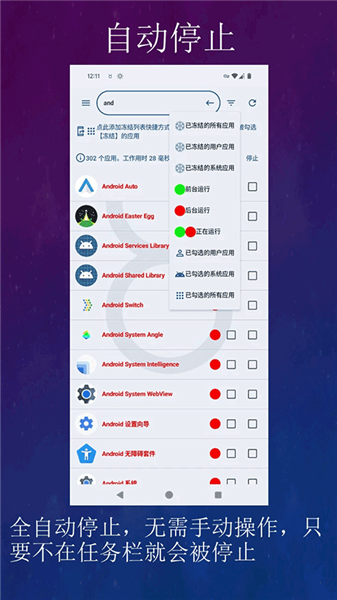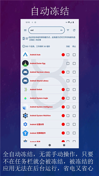 自动冻结后台应用、自动停止后台应用、防止后台应用持续运行、强行停止后台应用、卸载系统应用