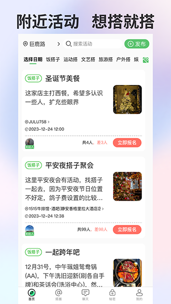 搭子社交app是一款针对现代年轻人社交需求开发的创新移动应用,它以用户间的共同兴趣和特定场景需求为基础,构建了一种精准化、便捷高效的社交方式。用户可以通过该软件寻找各类“搭子”,例如“饭搭子”共享美食时光,“运动搭子”一起锻炼,“学习搭子”相互督促进步等。软件特色在于其垂直细分的兴趣社群和活动组织功能,支持用户发起或参与线下活动,如剧本杀、观影、健身等。