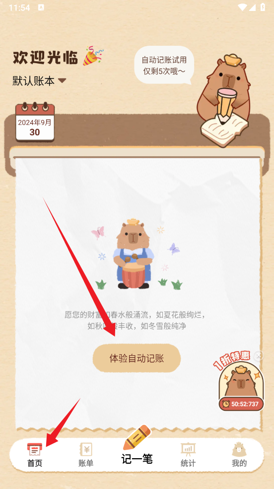 1、进入到首页,点击【体验自动记账】