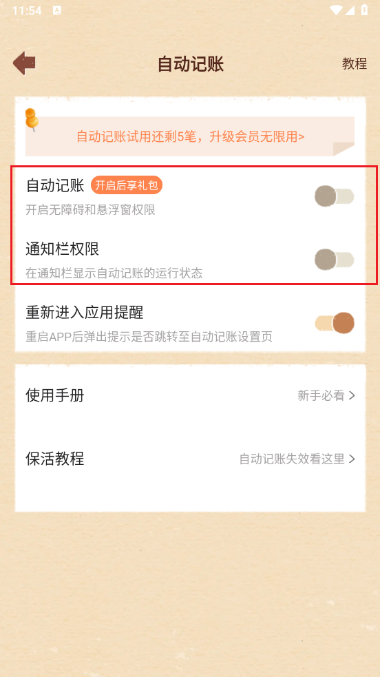 2、然后开启自动记账按钮,以及通知栏权限