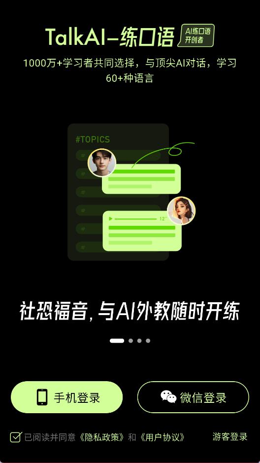 TalkAI练口语是一款外语口语训练应用,通过模拟真实对话环境,帮助使用者提升表达能力,提供多语种练习选项,涵盖日常交流、专业话题等多种场景,支持语音与文字交互,能根据使用者的语言水平动态调整对话难度,让练习更贴近真实交流体验。