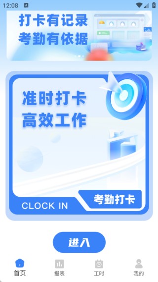 1、首页配备考勤打卡功能,支持准时打卡操作,助力高效推进日常工作,简化考勤流程。